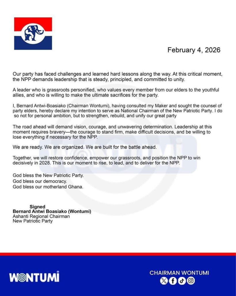 The Ashanti Regional Chairman of the New Patriotic Party (NPP), Bernard Antwi Boasiako, popularly known as Chairman Wontumi, has declared his intention to vie for a top leadership position within the party as it gears up for the 2028 elections.