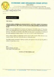 The clarification follows EOCO’s earlier statement issued on December 12, 2025, which announced the collaborative arrest of Frederick Kumi, also known as Emmanuel Kojo Baah Obeng, in connection with an alleged US$8 million romance scam.