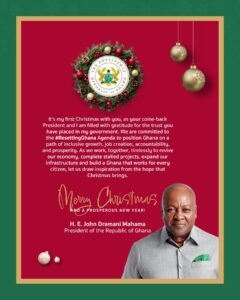 President John Dramani Mahama has expressed heartfelt gratitude to Ghanaians for the confidence reposed in his government, as he marked his first Christmas message since returning to office.