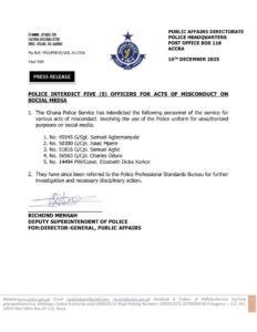 According to the statement, the interdiction follows investigations which established that the officers used their police uniforms for purposes not permitted by the regulations of the Ghana Police Service, particularly on social media.