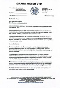 In a statement, GWCL emphasized the shutdown is necessary to carry out critical works aimed at ensuring the continuous supply of safe, reliable and sustainable water, especially during the Christmas festivities.